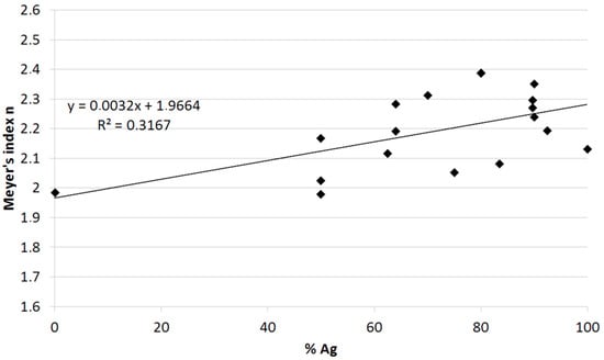 The simultaneous influence of silver content and age on the value of Meyer’s index can be expressed by Equation (2):