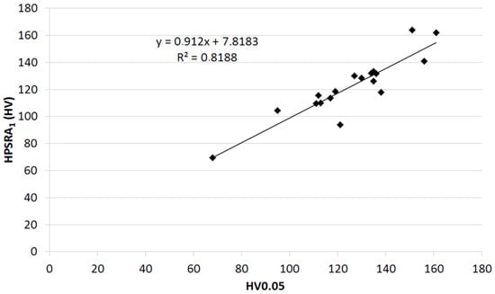 The minimum load W (N) is required to initiate plastic deformation, i.e., to create a visible impression. As reported by Sangwal et al. [], the values of W and the parameter A1, (N.mm−2), which is not dependent on the load, can be obtained from the regression of P (N) against d2 (mm). Parameter A1 (as well as c2, which generally has less accuracy) can be used to calculate the “true hardness” of HPSRA1, the values of which are given, as well as the values of W and A1 in Table 2. The relationship between the measured hardness of HV0.05 and the “actual hardness” of HPSRA1 is presented in Figure 5.