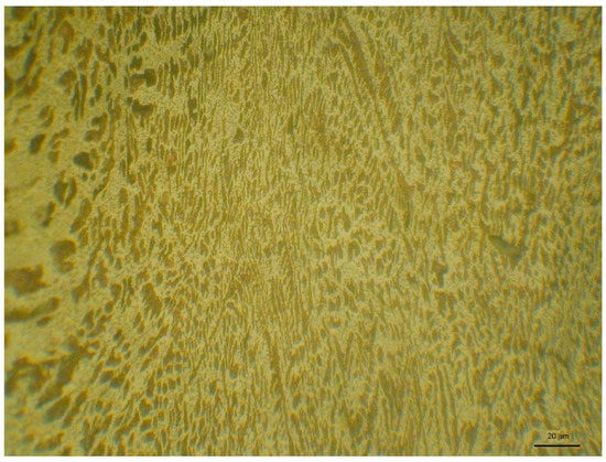 The microstructure was evaluated on a Neophot 32 optical microscope and ImageJ software. The micro-hardness was measured with a Hanemann micro-hardness tester, type Mod D32 (magnification 480×; the resolution of the smallest scale division of the device measuring the dimensions of the indentations is 0.000313 mm), part of the Neophot-32 microscope.