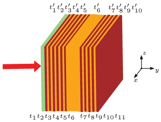 The multilayer structure under consideration, which represents a 1DPhC with a defect layer (an optical cavity with distributed Bragg reflectors), is characterized by a normal-incidence band gap in the reflection spectrum approximately 200 nm wide (580–780 nm). The 1DPhC was fabricated on a glass substrate by a thin film sputtering deposition technique, and the layer thicknesses of TiO and SiO were provided by the manufacturer (Meopta, Czech Republic) and estimated from an image obtained by the technique of scanning electron microscopy (SEM). From an SEM image (see Figure 1) captured by a scanning electron microscope (Quanta 650 FEG, USA), it was confirmed that the 1DPhC is composed of a system of twenty-one layers of TiO and SiO, including the SiO defect layer (optical cavity) with the largest thickness. We found that the layers of TiO ( 1, …, 11) have thicknesses , and similarly, the layers of SiO ( 1, …, 10) have thicknesses , as schematically shown in Figure 2; their values are specified in Table 1.