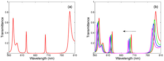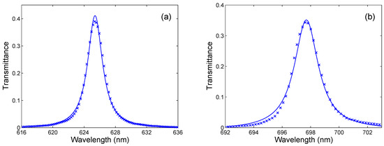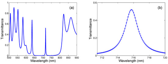 where is the central angular frequency, is the corresponding transmittance, and is the spectral half width. The conversion from the angular frequency domain to the wavelength domain can be performed using and , and Figure 3b illustrates the excellent approximation of the resonance peak by the Lorentzian function with the parameters: the central wavelength 715.74 nm, the half-width 1 nm, and the maximum transmittance 0.52.