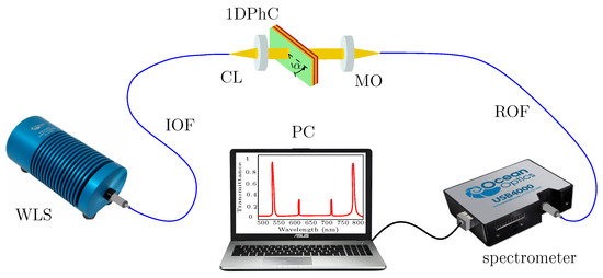 At first, the spectral transmittance of a 1DPhC with a defect layer was measured using the setup shown in Figure 5, where a white light source (WLS) was used. Light from the WLS (halogen lamp HL-2000, Ocean Optics, Dunedin, FL, USA) is launched into an input optical fiber (IOF) terminated by a collimation lens (CL) to generate a collimated beam of light incident at angle on the 1DPhC. The transmitted light is launched via a microscope objective (MO) into a read optical fiber (ROF) of a compact fiber-optic spectrometer (USB4000, Ocean Optics) to measure the transmittance spectrum in a wavelength range of 400–1000 nm. The transmission spectrum was normalized with respect to the signal recorded by the spectrometer without the 1DPhC.