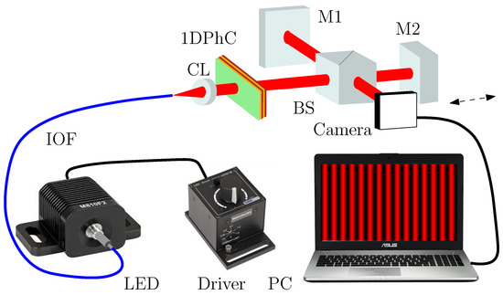 Because narrow spectral resonance peaks are lowered and broadened due to the limiting resolving power of the spectrometer [19], the method of Fourier transform interferometry was applied to overcome this limitation. The method is based on the measurement of the amplitude of a coherence function, or equivalently, a visibility function [62] from which the linewidth (full-width at half-maximum) can be obtained. The setup used to measure the visibility function is shown in Figure 6, and it comprises a Michelson interferometer with an LED and a defective 1DPhC at its input and a monochrome USB 3.0 camera (Basler, acA2440-75 ) to record a spatial interferogram. Light from an LED is launched into an input optical fiber (IOF) terminated by a collimation lens (CL) to generate a collimated beam of light. The beam excites the Michelson interferometer comprising the beam splitter (BS) and Mirrors 1 and 2 (M1 and M2), with one of them moveable to adjust the path difference. At the output, a camera is used to capture an interferogram by a personal computer (PC).