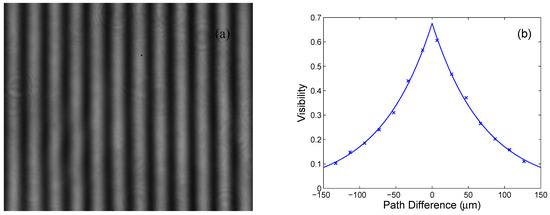 Interferogram captured by a camera for the first LED-based source and the smallest path difference (a). Measured visibility function (crosses) with a fit (b).