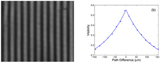 To measure the visibility function for the first LED-based source, a Michelson interferometer shown in Figure 6 was used and the interferogram captured by a camera was processed for different path lengths . The processing of the interferogram includes smoothing and evaluation of the intensity, as illustrated in a previous paper [64], to obtain their extremal values and express the visibility. As an example, an interferogram composed of the spatial interference fringes with a visibility of 0.606 is shown in Figure 9a for the smallest path difference. Figure 9b then shows the measured visibility function together with the theoretical one corresponding to Equation (10) with the coherence length and the linewidth 1.72 nm, which is smaller than the one obtained from the spectral measurement shown in Figure 8a. The highest visibility is lower than one owing to the effects of the excitation part of the setup (the input multimode optical fiber of a given core diameter and the collimation lens), justifying the difference from the point-like source.