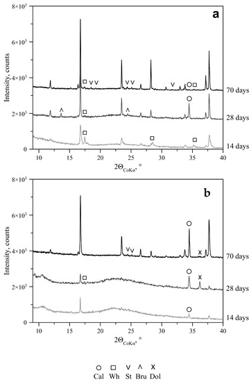 Powder X-ray patterns of crystals in mycelium of P. chrysogenum formed on marble surface in experiments with various glucose contents: (a)—10 g/L—and (b)—30 g/L. Unmarked diffraction peaks belong to weddellite. Here and in Figure 2, Figure 3 and Figure 4: Dol—dolomite, Bru—brushite, St—struvite, Wd—weddellite, Wh—whewellite, and Cal—calcite.