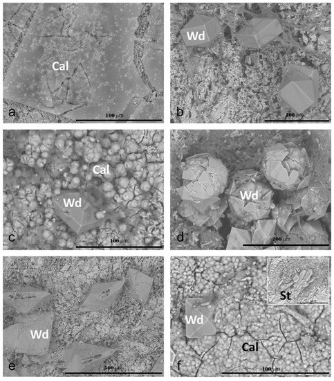 Weddellite was represented by dipyramidal–prismatic crystals of different generations (Figure 3b,c,e,f), which could grow on secondary calcite globules, forming composite spherical intergrowths (Figure 3d). The sizes of the weddellite crystals increased during growth and reached 250 µm on the 28th day at a glucose content of 30 g/L (Figure 3e). Starting at this moment, traces of dissolution were visible on the crystals. Whewellite crystallized in the form of small lamellar crystals (up to 25–30 µm). On the 70th day of the experiment, a very strong dissolution of the marble was seen as well as fungal hyphae encrusted with secondary calcite in the form of “tubes” (Figure 3f). Weddellite formed large and small, often split, crystals and intergrowths with traces of dissolution.