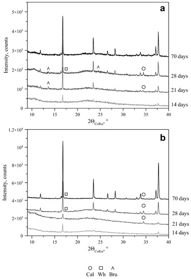 According to PXRD, calcite, at a glucose concentration of 1 g/L, was detected on days 14, 21 and 28 at pH = 6.5–7, respectively. The presence of a thin crust of secondary Mg-bearing calcite on day 14 was confirmed through SEM with the EDX data (Figure 3a). In addition, according to the PXRD data, brushite was found on days 7, 21 and 70, and struvite was found in a very small amount on day 21. At glucose concentrations of 10 and 30 g/L, the phase composition of the mycelium of the bacterial–fungal association in the range of 7 to 70 days (Figure 4) showed practically no differences compared to the composition of the mycelium in the monocultures of the fungus in the same time interval (Figure 2).
