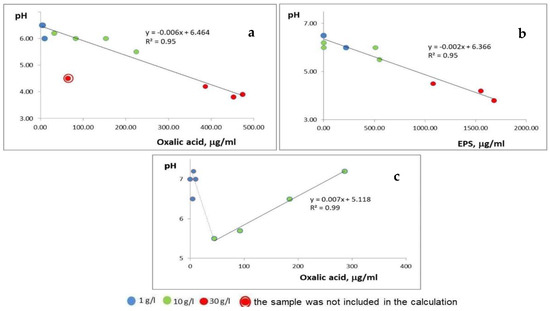 The correlations between pH and components of the cultivation medium: (a)—oxalic acid in P. chrysogenum, (b)—EPS in P. chrysogenum—and (c)—oxalic acid in P. chrysogenum–B. subtilis association.