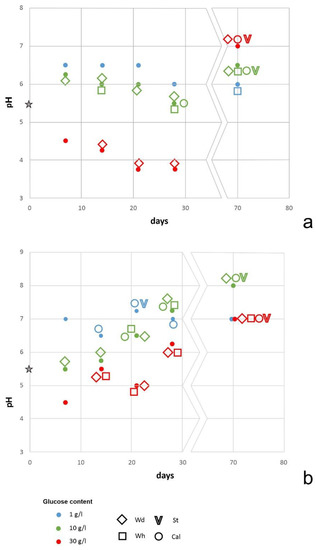 pH variations and phase formations under the action of microorganisms: (a)—fungus P. chrysogenum—and (b)—P. chrysogenum–B. subtilis association. Glucose content: blue—1, green—10—and red—30 g/L. Wd—weddellite, Wh—whewellite, St—struvite, Сal—calcite;