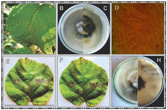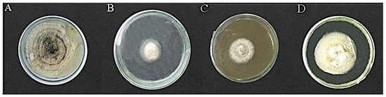 Surfaces of collected diseased leaves were treated with 75% ethanol and rinsed three times with autoclaved distilled H2O. From each sterilized leaf, minor diseased portions (<1 cm2) were excised and located on petri plates possessing potato dextrose agar (PDA). The petri plates were placed in an incubator at 28 °C for three days. After visible mycelial growth, single spore cultures were produced on PDA and incubated again. After one week of incubation, protrusive mycelial growth was examined and photographed from both the front and back sides of the petri plates.