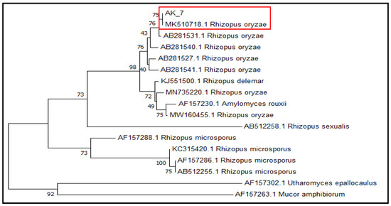 Phylogenetic study of the isolated R. oryzae sequence with 14 closely related ITS sequences after BLAST analysis. After 1000 replicates, the bootstrap values are presented at the branch points.