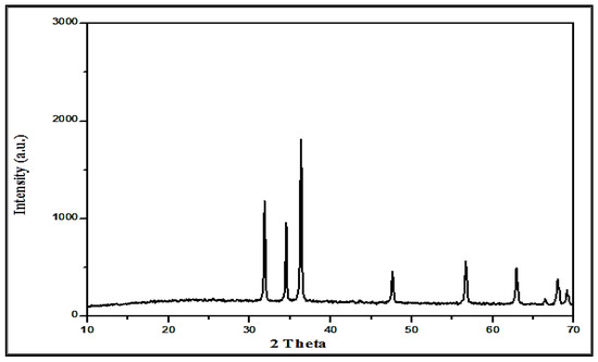 The crystal structure of MB-ZnO was explored with a scanning rate of 1° per minute in 0.013° steps, encompassing a 2-θ angle from 10° to 70°. The XRD spectrum exposed nine key peaks of biochar nanocomposite (Figure 6). The diffraction peaks at 2-θ = 31.78, 34.43, 36.26, 47.55, 56.6, 62.9, 66.8, 67.9, 68.9, and 72.7° corresponded to the (100), (002), (101), (102), (110), (103), (200), (112), (201), (004), and (202) planes, individually [40]. MB-ZnO displayed the diffraction peaks indexed to hexagonal structure following the JCPDS no. (036-1451). The intense and short peak suggested no huge effect of the presence of carbon on the crystalline structure of ZnO [41]. The average normal size of the prepared MB-ZnO particle was calculated as 46 nm using an X-ray line broadening system [42].