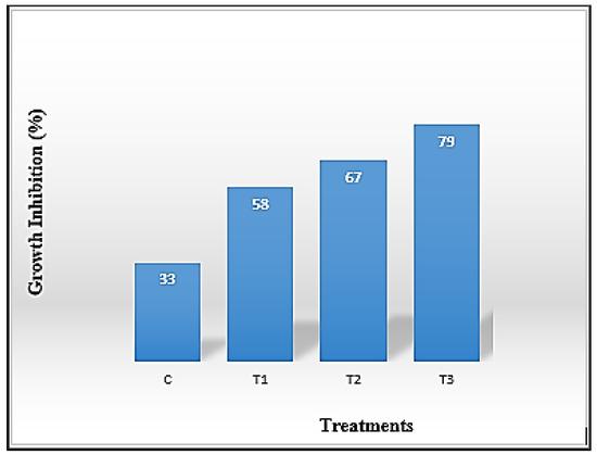 Variable mycelial inhibition was observed at different concentrations of the MB-ZnO nanocomposite on PDA media (Figure 10). A similar kind of fungal inhibition has been observed earlier [48]. The highest growth inhibition (79 ± 2.1%) was observed at 19 mg/mL dose rate (Figure 11), next was (67 ± 1.7%) at 12 mg/mL dosage, and (57.77 ± 0.5) at 6 mg/mL application rate. Additional escalation in the application rate of the MB-ZnO nanocomposite did not enhance growth inhibition, which might be due to rises in dosage resulting in the clustering of the MB-ZnO. Nanocomposite has a minor size but greater surface-to-volume ratios, making them greatly unstable and reactive [49]. The physiochemical aspects, such as size, Brownian movement, and surface properties may also influence accumulation.