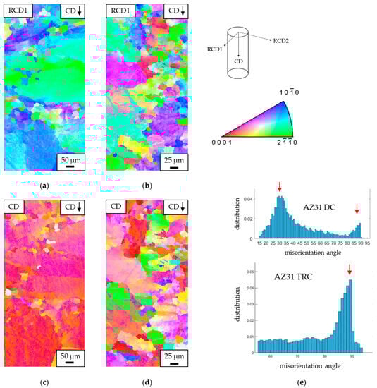 (a) EBSD and (b) inverse pole figures of the DC cast and heat treated (400 °C, 12 h) AZ31 in radial casting direction 2 (RCD2) and longitudinal casting direction (LCD) [42]. (c) EBSD and (d) inverse pole figure of the twin-roll cast and heat-treated (460 °C, 15 min) magnesium alloy AZ31 in radial casting direction 1 (RCD1) and twin-roll cast direction (TRCD).