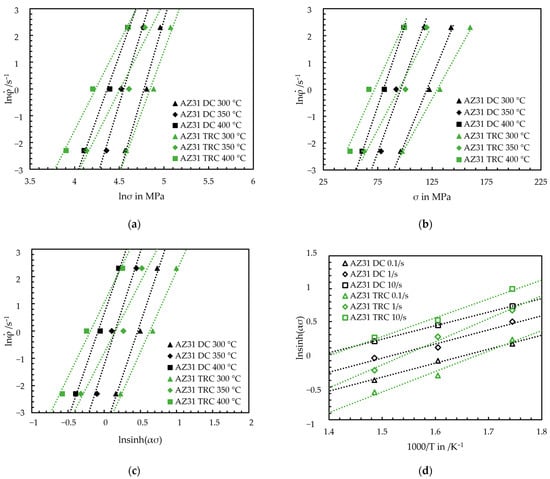 whereas represents the effective strain rate in s−1, T the thermodynamic temperature, R is the ideal gas constant (8.314 J(mol.K)), and are the peak stresses. In the case of AZ31 DC and AZ31 TRC, the following results can be presented [42]: