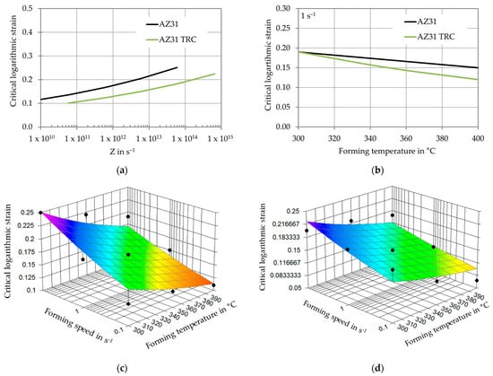 As described, the Zener–Hollomon parameter was determined mathematically. Figure 9a shows the logarithmic strain for recrystallization in dependence on the Zener–Hollomon parameter. The critical degree decreases with the increasing forming temperature (see Figure 9b) and reduced strain rate, so the start of dynamic recrystallization shifts to lower logarithmic strains. Hereby, the influence of forming temperature is greater than the influence of the strain rate. The twin-roll cast AZ31 alloy shows significantly lower logarithmic strains in dependence on Z and the forming temperature compared to the direct-chill cast AZ31 alloy. In addition, the critical strain for all speeds and temperatures was graphically displayed from the experimental data and compared with the calculated results (see Figure 9c–f). In the case of the DC AZ31 alloy, the critical logarithmic strain for dynamic recrystallization for all speeds and temperatures lies between 0.11 and 0.25. The twin-roll cast AZ31 exhibits slightly lower values for the critical degree for all speeds and temperatures (0.07–0.20). It is assumed that the lower grain size and already deformed grain structure help to shift the beginning of dynamical recrystallization to the lower values.