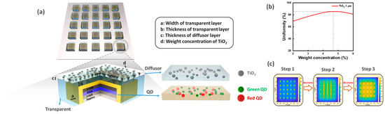 The mini-LED backlight module is a leading development in current display technology. As shown in Figure 1a, the module primarily consists of a substrate, a receiving plane, and a structured LED design. This study’s mini-LED backlight module employs blue light characterized by a Gaussian distribution of wavelength spectrum, a spectral peak of 450 nm, and a full width at half maximum (FWHM) of 18 nm. In combination with a red and green QD mixing film, it produces white light through light mixing. To achieve greater illumination uniformity, we initially designed and optimized a single mini-LED package structure, as depicted in Figure 1a. The mil blue LED wafer is enveloped in a 30 μm thick QD layer. This transparent layer of optical material, mixed with red and green QDs, serves to convert white light color. A protective transparent layer coats the QD layer, guarding the unstable QDs against forms of degradation such as self-aggregation while providing a mixing distance. Lastly, an atomized layer, composed of a transparent adhesive and TiO2 scattering particles, is situated on top of the LED to widen the angle of divergence. We established four parameters—the transparent layer’s width and thickness, the diffusion layer’s thickness, and the TiO2 particle concentration in the diffusion layer—as adjustable for synchronized optimization to achieve the best uniformity parameter combination, demonstrated in Table 1. To ensure the accuracy of the optical simulation, we established a single LED model based on the above conditions and compared it with actual LED samples possessing the same parameters. We found that the simulation results closely resembled the actual products’ light-emitting fields, indicating the simulation’s reliability. Figure 1b,c demonstrate the impact of the TiO2 particle concentration in the diffusion layer, which can be divided into three stages. In the first stage, if the diffusion particle concentration is too low, the fogging effect is inadequate, leading to a small LED dispersion angle, poor gap brightness, and poor uniformity. However, upon reaching a certain critical concentration, the excessive diffusion concentration of particles suppresses the LED’s frontal light output, decreasing the uniformity. Given that we aim for the thickness of a single LED in this backlight module to be under 300 μm, this study will develop an optimization method for the four-variable design of the architecture.