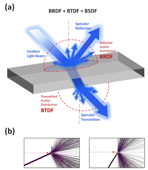 In our comprehensive optimization framework, we incorporated the optical parameter of the structured sheet as the bidirectional scattering distribution function (BSDF). This function calculates the surface scattering optical properties of the material under microscopic conditions [31]. The BSDF combines the bidirectional reflectance distribution function (BRDF) and bidirectional transmission distribution function (BTDF) [32,33], as depicted in Figure 3a. The BSDF describes how a ray of light projected onto a material surface generates scattered light in various directions due to surface properties, with the scattered light direction changing along with incident light changes. Besides understanding a material’s BSDF through measuring scattered light, we can also simulate the scattering effect if the material’s BSDF properties are known. In our model design, the backlight module’s top layer comprised multiple geometrically small, light-transmitting materials. Due to light tracing limitations in optical simulation software, the simulation results can easily become distorted. Therefore, we improved the actual bidirectional scattering distribution function of the light by sending the structural model for measurement to achieve simulation results closer to the actual conditions, as shown in Figure 3b.