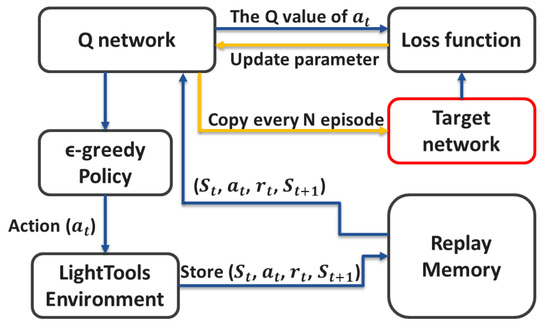 We present a comprehensive design methodology to achieve the optimal simulation results, as depicted in Figure 2. Figure 2a outlines the program’s operation and linkage flowchart. First, we created a mini-LED backlight module as an environment model using LightTools (8.6.0) optical simulation software and imported the structure’s optical parameters. We then combined LightTools’ new pickup function with MATLAB to set four different variables influencing the illumination uniformity. Following the simulation in LightTools, MATLAB collected mesh data from surface receivers and calculated the illumination uniformity. Lastly, we implemented the DDQN algorithm via Python to allow it to act as the reinforcement learning (RL) agent in the experimental process. This algorithm enabled the agent to interact with the environment, developing an optimization method for the architecture’s variable design and identifying the optimal solution for illuminance uniformity by connecting it to LightTools’ simulated illuminance uniformity. We utilized LightTools to establish the mini-LED backlight module, as shown in Figure 2b. The architecture primarily comprised three parts: the mini-LED (light source), a structural sheet, and a surface receiver. We created five absorbing surfaces as a baffle wall to encase the entire model and simulated a mini-LED backlight module using a 5 × 5 array Mini-LED array with a structural sheet atop it, investigating the illumination uniformity.