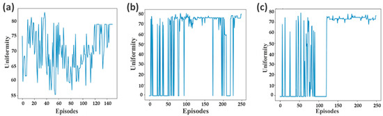 (a) Setup completed with hyperparameters but not yet adjusted. (b) Optimized learning rate and ε-decay value settings, but poor convergence. (c) Optimizing the reward function allowed the data to converge.