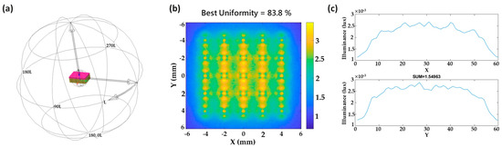 (a) Mini-LED simulation model in LightTools. (b,c) Optimizing the illumination uniformity of the result.