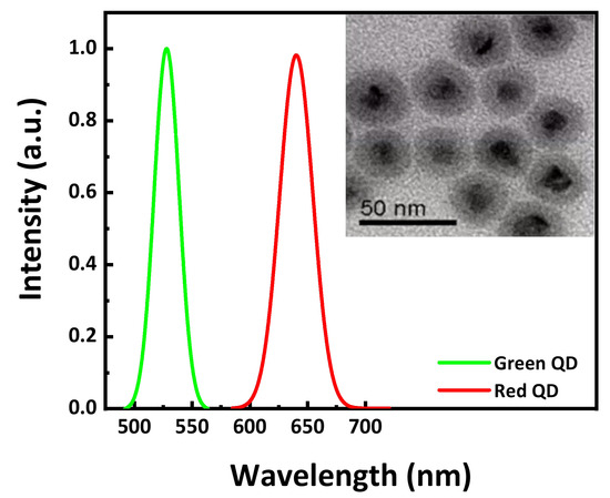 The electroluminescence spectra of the green and red QD; the inset is the optical microscopic photo of the QDs.