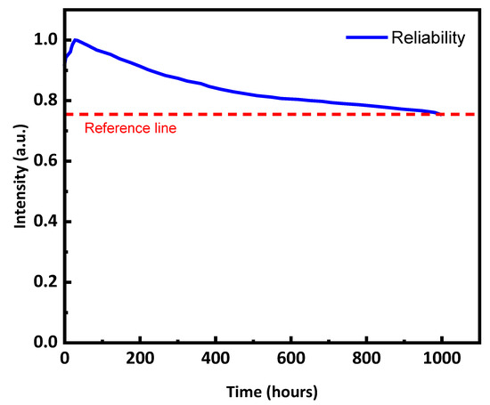 Once the QD layer is prepared, it is paired with a blue mini-LED to create a display. This step verifies the optimal parameter outcomes from the simulation. We used a spectrophotometer (Minolta CS-1000T), an image generator (Chroma 2403), and a robotic arm (ABB IRB2600) to measure the display’s reliability. The luminance uniformity exceeded 90%, and the average center luminance was measured at 1057 cd/m2. A high-temperature and high-humidity reliability test of the mini-LED backlight module was also conducted. The module was tested with long-term light aging at a temperature of 60 °C and 90% relative humidity, as depicted in Figure 9. The results indicate that the illumination intensity of the mini-LED gradually converged to 75.5% after 996 h of testing. For the section concerning QD composite films, our team has previously published measurement data related to reliability [16]. We utilized ALD passivation protection technology to coat the QD surface with a protective Al2O3 layer, thereby enhancing its weathering resistance. Measurements were conducted for various tests, including a current variation test, a long-term light aging test, and a temperature/humidity test at 60°/90%. Our paper indicates that, after 1100 h in the long-term aging test, efficiency was reduced to only 0.225 of its original value, which corresponds to an LT50 of approximately 2300 h. For the 60°/90% temperature/humidity test, the LT50 was around 6070 h, demonstrating excellent wavelength stability and reliability.