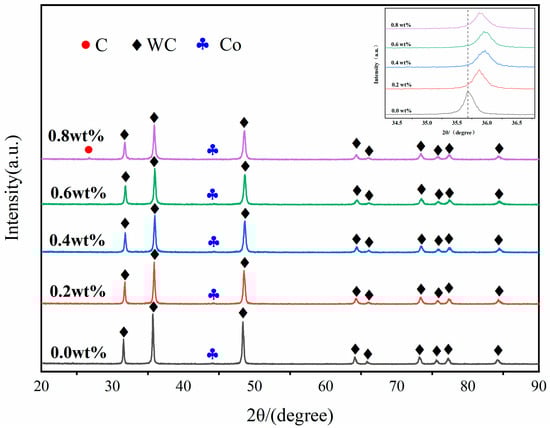 XRD patterns of cemented carbide with different graphene contents at 1350 °C, 8 min, and 50 MPa.