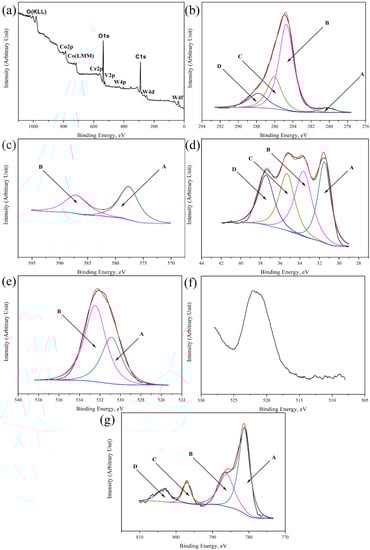 As can be seen from Figure 2e, peak A (530.9 eV) corresponds to WO3 or CoO, which is a phenomenon caused by oxidation of the sample surface. Similar phenomena have been reported in other studies [30]. There is only one more prominent peak whose bending energy is 522.1 eV in Figure 2f, which corresponds to the VC. As shown in Figure 2g, the bending energy of peak A is 781.8 eV, which corresponds to CoO, and peak B (786.8 eV), peak C (797.6 eV), and peak D (803.2 eV) all correspond to other compounds of Co.