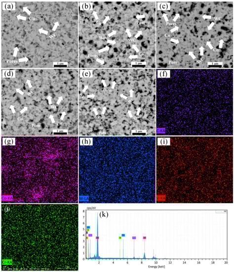 Microscopic morphology of WC-Co-Cr3C2-VC-graphene carbide with different graphene contents at 1350 °C, 8 min, and 50 MPa: (a) 0.0 wt.%; (b) 0.2 wt.%; (c) 0.4 wt.%; (d) 0.6 wt.%; (e) 0.8 wt.%; (f–k) mapping and EDS spectra of WC-based carbide with 0.6 wt.% graphene.