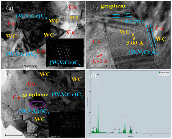 Figure 5 shows TEM and HRTEM images of cemented carbide with a graphene content of 0.6 wt.% sintered by SPS, allowing further observation of the microstructure and interface bonding of the sample. As can be seen in Figure 5a,c, the samples are mainly composed of Co, WC, (W, V, Cr) Cx, and graphene, where (W, V, Cr) Cx and graphene are mainly distributed between the WC/Co interface. It can be seen that the grain size of WC is 200–500 nm, and the phases are relatively uniformly distributed to form an organic combination since the incorporation of nano WC reduces the sintering temperature, leading to a prolonged solid–liquid transition time, which in turn facilitates the plastic flow of hard particles and particle rearrangement under high-temperature conditions [34]. The HRTEM image shows that the compound with a crystal plane spacing of 3.00 Å is WC and the compound with a crystal plane spacing of 1.92 Å is Co, the amorphous material corresponds to graphene, as shown in Figure 5b. The electron diffraction map in Figure 5a corresponds to (W, V, Cr) Cx, and the image in Figure 5c is a combination of electron diffraction clouds and fuzzy lattice forms for selected regions of graphene. This shows that during the SPS process, the surface of graphene reacts chemically with carbides or complexes to form new compounds. Due to the different solubility of the hard particles in the binding phase, the formation of (W, V, Cr) Cx between the Co/WC interface helps to optimize the microstructure and overall properties of the sample. The incorporation of graphene played different degrees of bridging and toughening roles at different interfaces. Figure 5d is the EDS spectrum at the purple circle in Figure 5c, from which it can be analyzed that the added graphene is attached to the surface of the WC grain. Combined with the HRTEM diagram, it can be found that graphene can tightly bind Co and WC particles in the form of rotation and deformation and prevent the diffusion of element C from the WC to Co phase to react to form Co3C. Graphene can also inhibit the mutual diffusion and growth of the Co phase so that the grain size is kept in a small range, thereby improving the fracture toughness of cemented carbide.