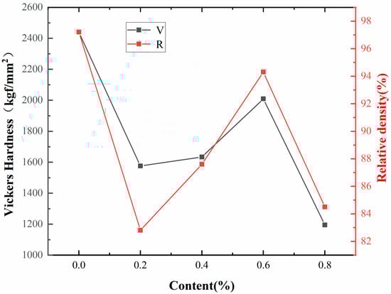 Figure 7 shows the effect of different levels of graphene on the mechanical properties of WC-based cemented carbide specimens. It can be seen from Figure 7 that under spark plasma sintering conditions, with the increase in graphene content, the density and hardness of cemented carbides show a trend of first increasing and then decreasing. When the graphene content is 0.0 wt.%, the hardness and relative density of cemented carbide are the highest, which are 2440 HV and 97.2%, respectively, and the fracture toughness of the specimen is 12.05 MPa·m1/2 at this time. As shown in Figure 7, the relative density and hardness of the cemented carbide reach a maximum value of 94.3% and 2009 HV when the graphene content is 0.6 wt.%, and the fracture toughness of the specimen is 11.72 MPa·m1/2 at this time. Studies have shown that the higher the grain density of WC and the finer the grain size, the more difficult it is to generate and move dislocations, thus improving the mechanical properties of composites [35]. In this study, this is also confirmed by the trend of hardness variation with the graphene content because the graphene particles are sheetlike, so it can effectively hinder the growth of the grain during the sintering process, thereby improving the mechanical properties of the composite. As the graphene content continues to increase, the hardness and density of the specimens show a decreasing trend, which may be due to the fact that the addition of graphene will affect the penetration and diffusion of the Co binding phase, resulting in the phenomenon of Co phase aggregation, thereby inhibiting the improvement of the mechanical properties of WC-based cemented carbide. It is also possible that because of the size of graphene particles at the nanoscale, with the increase in graphene addition, graphene itself is prone to agglomeration. The aggregated graphene not only reduces its adsorption capacity but also affects its excellent properties, resulting in the refinement of WC particles, which reduces the mechanical properties of WC-based cemented carbide [36].