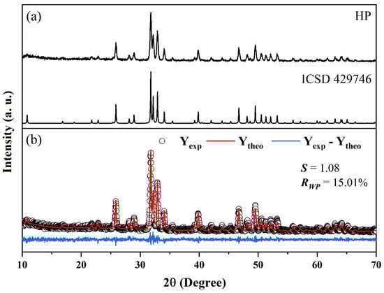 (a) XRD pattern of the HAP sintered and ICSD 429746. (b) Rietveld refinement of the HAP spectrum.