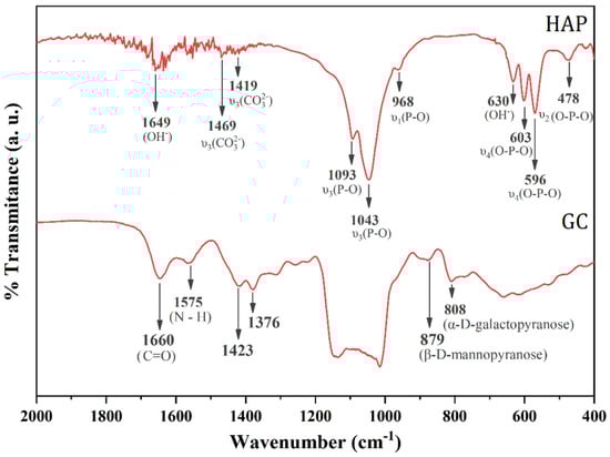 Overall, the XRD pattern, Rietveld refinement and FTIR collectively indicated that the methodology of synthesis of HAP nanocrystalline powders was efficient, allowing us to obtain a single HAP phase. The FTIR spectrum showed that the GC blending process did not promote an alteration of the vibrational properties, presenting characteristic bands of galactomannan and chitosan.