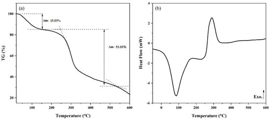 The thermogram of the GC blend, shown in Figure 6a, indicates that the thermal decomposition occurs in two stages. In the first, in the range of 25 to 150 °C, there is a loss of 15.03% of the initial mass of the sample resulting from the water release. In the second, between 200 and 350 °C, a pronounced decline in the TG curve is observed, referring to the disintegration of macromolecules related to the polymeric groups present in the blend as well as the decomposition of the organic material, which results in the loss of another 53.85% of the initial mass.