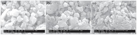 The sample morphology was investigated using SEM. Figure 7 presents the micrographs of H70GC30, H80GC20 and H90GC10 bioceramics, with a magnification factor of 25,000×. The grains can be described as small spherical particles, being in consonance with the morphology presented by pure hydroxyapatite.