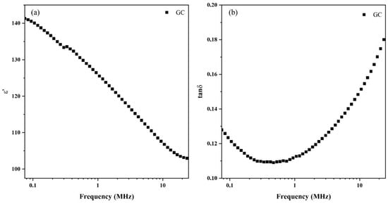 The dielectric behavior of the GC blend as a function of frequency is depicted in Figure 8. Figure 8a shows that the dielectric constant, , at room temperature and in the frequency range considered. This constant decreases monotonically with increasing frequency. The continuous decrease of the dielectric constant with increasing frequency is a common behavior for all dielectric materials [] and is due to the fact that when the frequency of the applied electric field increases, the mechanism of polarization will not be able to follow the change in the electric field and, therefore, the contribution of polarization to the dielectric constant will diminish [,,]. At higher frequencies, when already in the limit of the measurement window, it is possible to infer that the values tend to stabilize, a prediction supported by the dielectric behavior observed in several polymers []. Figure 8b presents the tangent loss, tanδ, as a function of the frequency. The inexistence of peaks shows that, at room temperature and in the frequency range of the measurements, the CG blend does not present any relaxation phenomenon and, since the values of tanδ are inferior to one, based on Equation (11), it is possible to conclude that the dielectric losses are inferior to the dielectric constant.