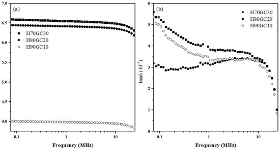 The dielectric properties of the bioceramics H70GC30, H80GC20 and H90GC10, depicted in Figure 9, are related to the different types of polarization present in the sample. The interfaces of bioceramics with biopolymers have a large number of defects that result in an unequal distribution of charges []. It can be verified in Figure 9a that the increase in the amount of GC promoted the increase of . This enhancement in the dielectric constant values shows the increased energy storage capacity of the studied bioceramics [,,,,,]. With the addition of GC, cations are the dominant charges and may be responsible for the increase in the dielectric constant []. Until ≈ 10 MHz, the samples show a quasi-frequency independent behavior, indicating that the materials do not exhibit intense polarization processes and that the stored charge remains practically constant in the frequency range considered. At higher frequencies (>10 MHz), the charge carriers are unable to follow the rapid changes in the applied electric field and, as a consequence, the dielectric constant values start to decrease [,].