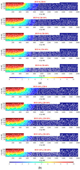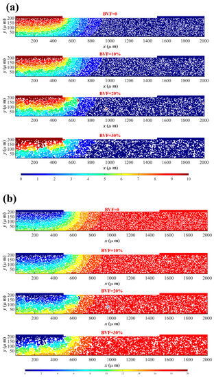 The distribution of oxygen concentration within the GDL at different binder volume fractions is demonstrated in Figure 2a. Observing the structure of GDLs at different binder volume fractions, the solids in the GDLs were more uniformly distributed when the BVF was low, such as when the BVF was 0 or 10%. When the BVF was high, such as 20 or 30%, on the one hand, the solids became more easily distributed in chunks or chains, and several lumps of solids tended to form a chain and led to the blockage of the gas transport throat. On the other hand, more binder filled the small pores, and connected binder appeared between multiple adjacent fibers, leading to the emergence of closed pores, which is very unfavorable for gas transport within GDLs. The oxygen concentration distribution showed a gradual decrease from the inlet to the outlet because oxygen was consumed at the catalyst layer. Oxygen-poor regions occurred within the GDL close to the outlet side, where oxygen was almost depleted, which can lead to oxygen starvation and the intensified polarization loss of the PEMFC being exacerbated. The water vapor distribution at different binder volume fractions is given in Figure 2b. Water vapor was generated in the catalyst layer and was carried by a mixture of oxygen and nitrogen toward the outlet so that there was an accumulation of water vapor in the area close to the outlet. In addition, at binder volume fractions of 20% and 30%, in the region below the inlet, a chain-like structure due to the increase in binder volume fraction was observed to be a clear boundary of the water vapor concentration distribution, indicating that the water vapor concentration distribution was affected by the GDL structure.