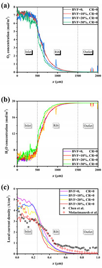 The distribution of oxygen and water vapor concentrations along the x-direction and the current density distribution on the surface of the catalyst layer is depicted in Figure 3. For ease of comprehension, the inlet, rib, and outlet are illustrated in the figure by dashed lines, indicating that the area illustrated is the GDL below that location. From Figure 3a,b, the distribution of oxygen concentration and water vapor concentration below the exit region shows an oscillating pattern. Oxygen was supplied in time below the inlet so that from x = 0 to x = 500 µm, the local current density was high, and the changes in oxygen and water vapor concentrations were not drastic. Due to the obstruction of the rib, the lateral transport of oxygen was weakened so that the supply of oxygen below the rib was gradually weakened, and a rapid decline in oxygen concentration and current density occurred. Unusual and sudden fluctuations in oxygen and water vapor concentrations in the area below the rib and outlet were due to the formation of closed pores. In Figure 3c, the obtained current density is compared to the results of Chen et al. [27] and Molaeimanesh et al. [25]. The reason for not being able to match exactly is due to differences in the microstructure of the GDL, but the trend and the range of the distribution of the current density are very close to each other, corroborating the applicability of the LB model developed in this study. For the binder volume fractions of 0, 10%, 20%, and 30% calculations, the average oxygen concentrations were 2.4070, 2.3984, 2.3184, and 3.0770 mol/m3, respectively, and the average water vapor concentrations were 15.0747, 15.0948, 15.2399, and 15.7054 mol/m3, and the average current densities were 1.6402, 1.4819, 1.3432, and 1.1062 A/cm2. Compared with the no binder case, the current density decreased by 8.43%, 18.1%, and 32.55% in the cases with BVF = 10%, 20%, and 30%, respectively, and the higher the binder volume fraction, the more significant the decrease in current density. Cathode electrochemical performance decreased with increasing binder volume fraction, and the presence of block and chain structures resulted in a weaker mass transfer. However, this study is an analysis of electrochemical performance, and a more comprehensive judgment would require studies of other aspects, such as strength and resistance.