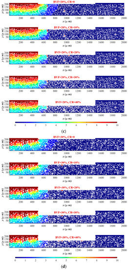 The average water vapor concentration along the x-direction within the GDLs for different binder volume fractions and compression ratios is given in Figure 6. Similarly, below the ribs and outlets were areas where water vapor was enriched. In the region below the inlet, for samples with different binder volume fractions, compression resulted in a slight decrease in water vapor concentration, which may be due to the fact that compression reduced the porosity of the GDL below the ribs, the gas flow rate below the inlet region was accelerated, and the water vapor was carried away faster after it was generated. As the electrochemical reaction rate remained constant, indicating that water vapor was being generated at a flat rate, compression had no effect on the concentration of water vapor in the GDL below the outlet. For the GDL below the rib, compression led to an increase in the concentration of water vapor, and the porosity of the GDL below the rib was enriched by the increase in gas transport resistance due to the compression being reduced, making it difficult for water vapor to be removed. The increase in compression ratio also resulted in a leftward shift in the location of the maximum water vapor concentration; for example, the locations of maximum water vapor concentration within the GDL with compression ratios of 0, 10%, 20%, 30%, and 40% were x = 1962 µm, 1465 µm, 1313 µm, 1172 µm, and 1017 µm, respectively, as an example of cases for BVF = 0. Untimely removal of water vapor may block the pathway for oxygen supply and have a negative impact on the performance of the PEMFC. Compression changes to the location of the maximum water vapor concentration should be taken into account to design a GDL structure to improve water–gas management. The sharp decrease in water vapor concentration in Figure 6b–d does not imply that water vapor is favorably excluded but is a phenomenon resulting from the closure of pores.