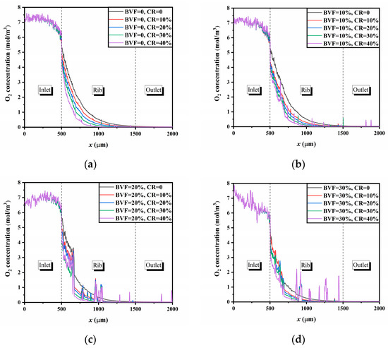 The average oxygen concentration along the x-direction within the GDLs for compression ratios: (a) BVF = 0, (b) BVF = 10%, (c) BVF = 20%, (d) BVF = 30%.