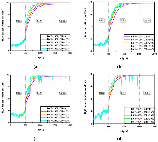 The average water vapor concentration along the x-direction within the GDLs for compression ratios: (a) BVF = 0, (b) BVF = 10%, (c) BVF = 20%, (d) BVF = 30%.