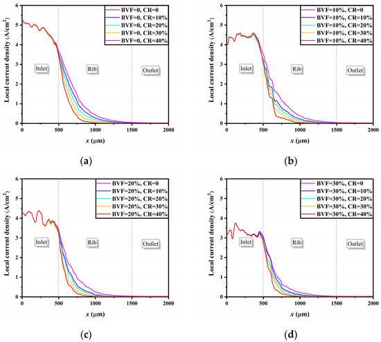 Distribution of current density on the surface of the catalyst layer at different compression ratios: (a) BVF = 0, (b) BVF = 10%, (c) BVF = 20%, (d) BVF = 30%.