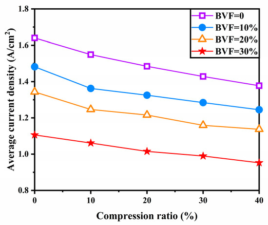 The average current density for all samples is given in Figure 8. The current density decreased close to linearly with increasing compression ratio, where slight fluctuations may be the effect of structural differences. For the samples with BVF = 0, 10%, 20%, 30%, and 40%, the average current density decreased by 32.55%, 31.48%, 31.59%, 30.70%, and 30.85% at a compression ratio of 40% compared with uncompressed, which was at a similar level.