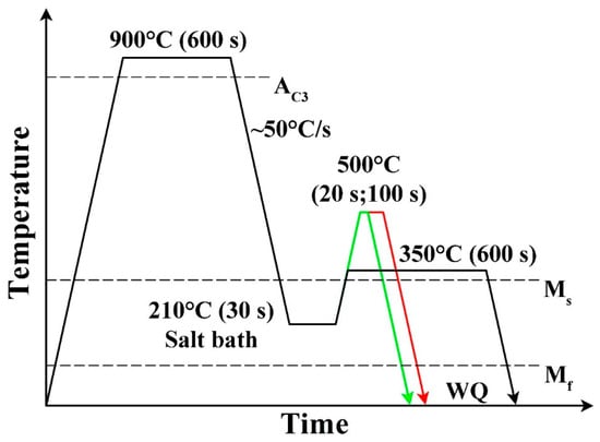 The steel was produced by air induction melting followed by electro-slag remelting [4]. Then the solution treatment was performed at 1150 °C for 4 h followed by hot forging at temperatures of 1150–950 °C into billets with dimensions of 60 × 150 × 450 mm3. Samples with 12 mm thickness were machined from the billets and austenitized at 900 °C for 10 min followed by quenching in a salt bath at Tq = 210 °C for 30 s (Figure 1). Next, the samples were subjected to isothermal holding at Tp = 350 °C for 600 s and at Tp = 500 °C for 20 s and 100 s in a second salt bath followed by water quenching (WQ) (Figure 1).
