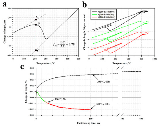 Change in length versus temperature obtained during water quenching of the steel (a) and during Q&P processing (b). Relative change in length as a function of partitioning time during Q&P processing (c).