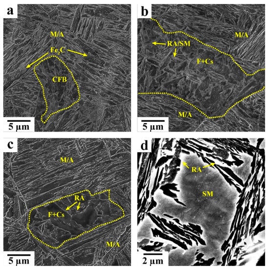 SEM microstructures of Q&P samples: (a) Q210-P350 (600 s), (b) Q210-P500 (20 s) and (c) Q210-P500 (600 s). (d) Coarse RA/SM island in the Q210-P500 (20 s) sample. M/A is the martensite/austenite constituent, CFB is the carbide-free bainite, SM is the secondary martensite and F + Cs is the ferrite + carbides.