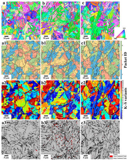 EBSD analysis of the steel after partitioning at 350 °C for 600 s (a–a3), at 500 °C for 20 s (b–b3) and at 500 °C for 100 s (c–c3). Inverse pole figure maps (a–c), EBSD maps showing the identification numbers of martensite packets and the reconstructed boundaries of PAGs (thick black lines) and HABs (thin black lines); (a1–c1), K–S variants maps (a2–c2) and phase maps (a3–c3).
